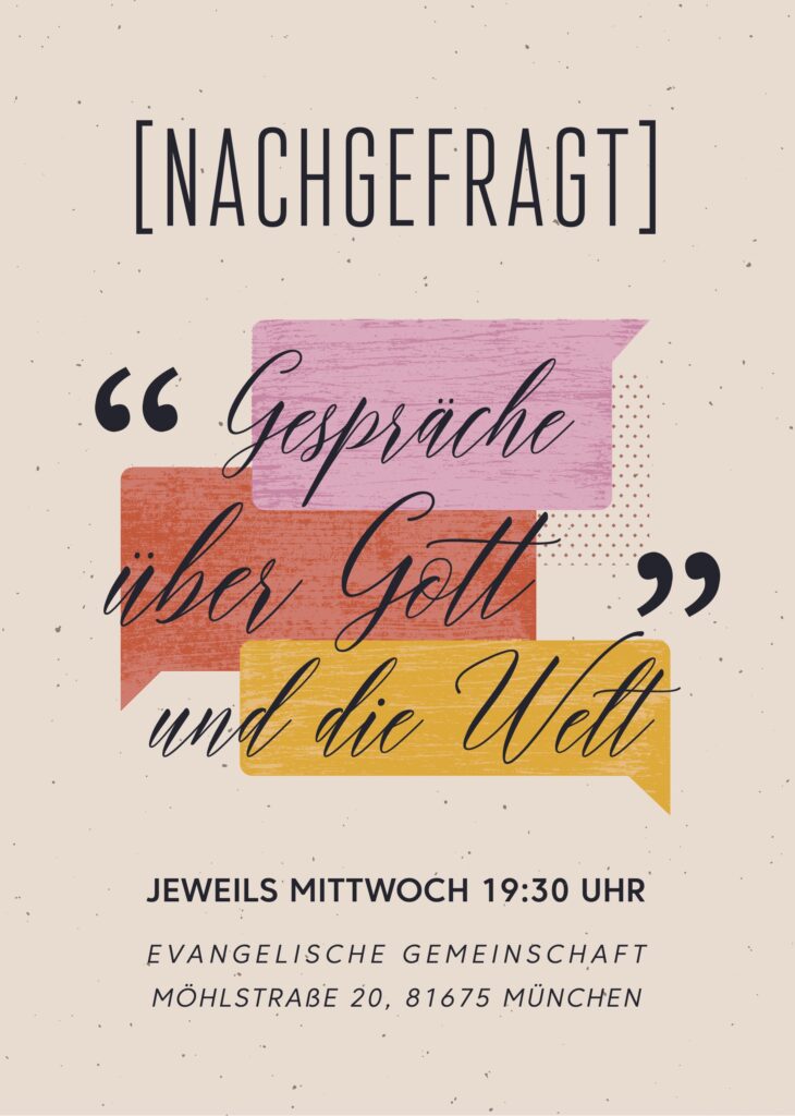 Wir treffen uns an drei Abenden, um über allerlei Fragen zu den Themen Glaube, Gott, Jesus oder die Kirche zu sprechen. Dazu geben wir an jedem Abend einen kleinen Impuls zu einem bestimmten Thema, der dann zu Gesprächen anregt.